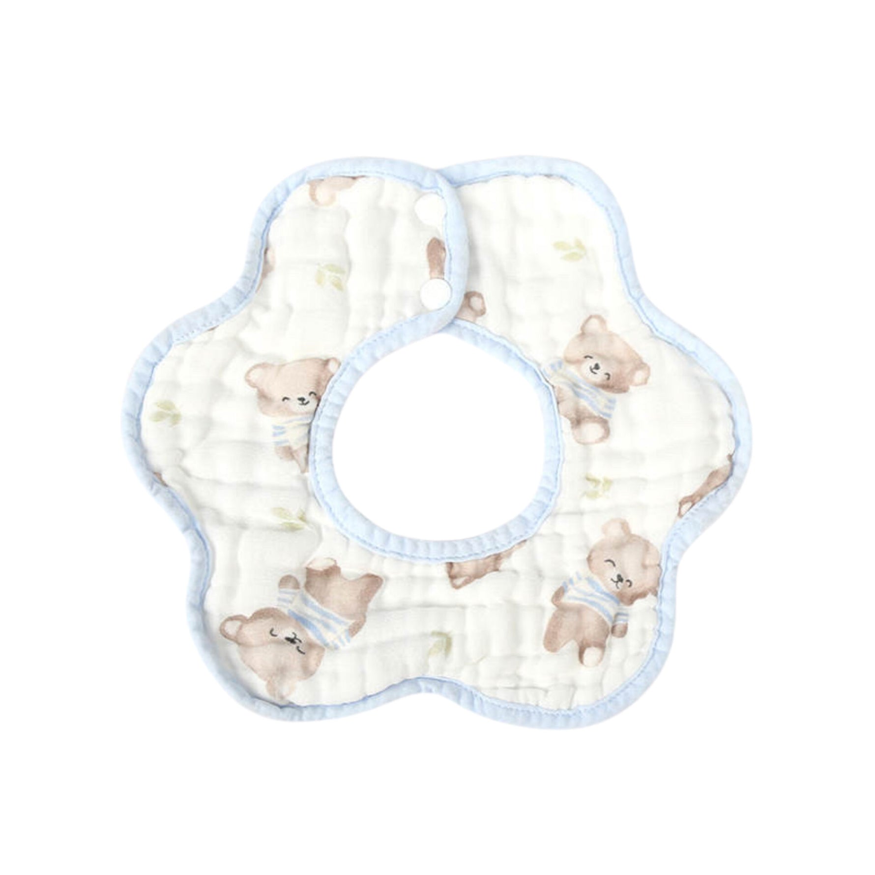 The Gabriel Bib is made of 8 layers of soft cotton gauze material. It is absorbent, lightweight and breathable. It has double snap fasteners for a snug fit. It can be used from 0 to 24 months.