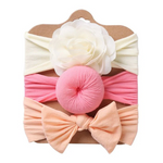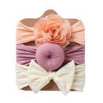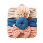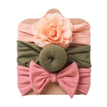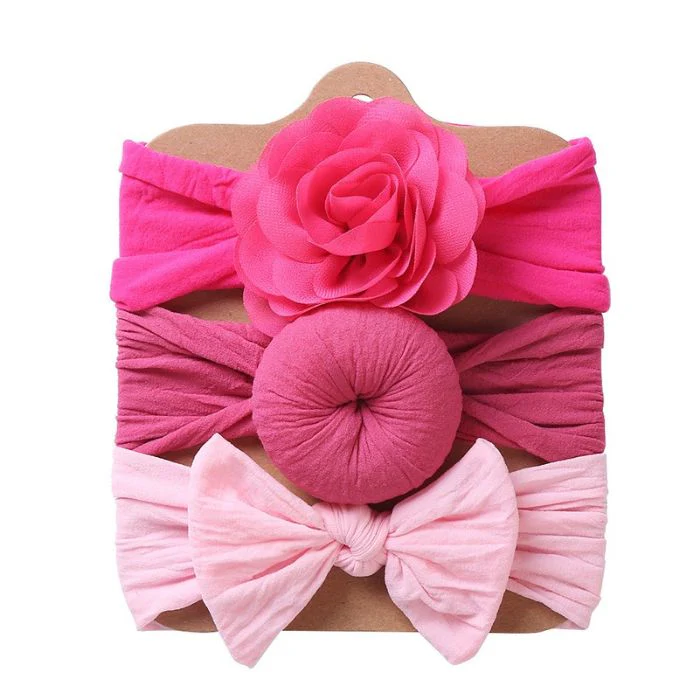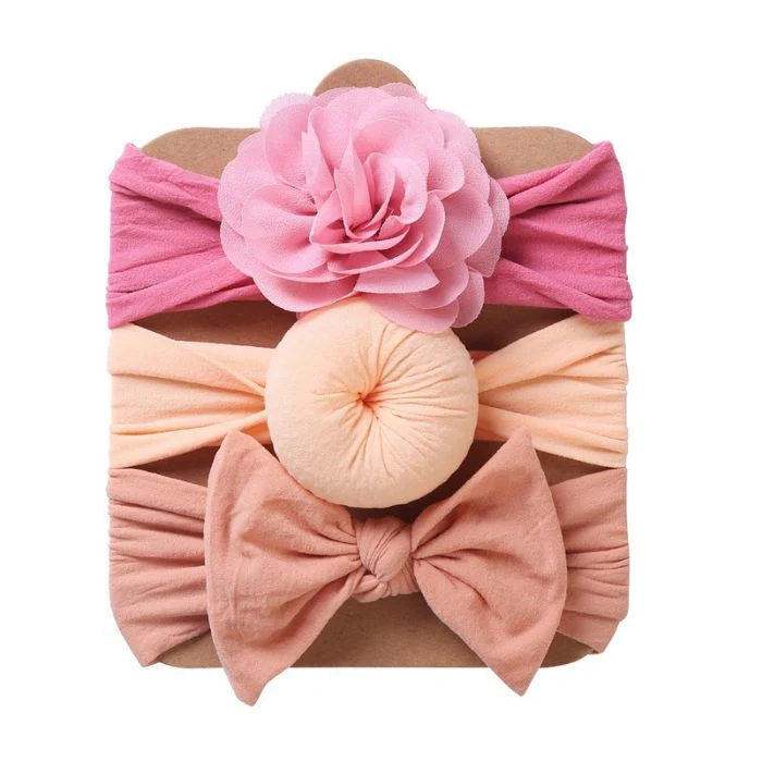 The Audrey Headband Set is for baby girls aged 0-12 months old (depending on baby’s head circumference). One set includes 3 headbands of different colors and styles: 1 donut style, 1 flower style and 1 bow style.