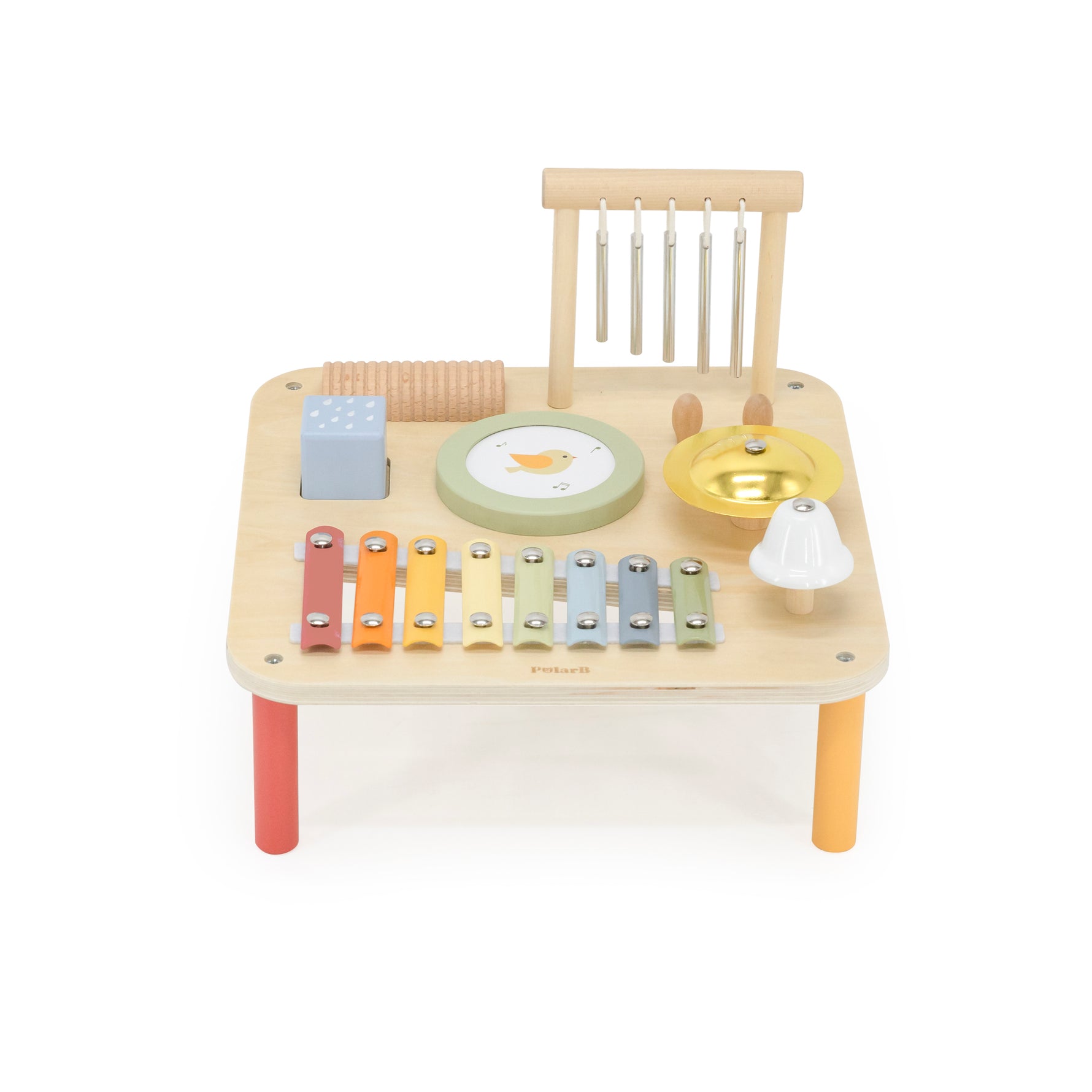 This musical table comes with 7 instruments: metal xylophone with 7 note, a scraper board, a drum, a music block, a bell, a gong and chimes with 5 tones. Great sound quality and can foster your child's interest in melody and music! Easy to assemble and ready to play.
