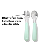 OXO Tot On The Go Fork and Spoon Set with Carrying Case is designed to be eary to use, whether taking your tot on a picnic, or sending them off to school. The Fork tines are effective enough for picking up food, but not too sharp to protect little fingers. The deep Spoon shape makes it easy to scoop. The curved, non-slip handles are easy for learning hands to hold and feature a flat spot to keep them from rolling away. The Fork and Spoon fit neatly in their compact travel case, which can be easily tucked into lunchboxes, diaper bags or purses for on-the-go-meals.