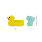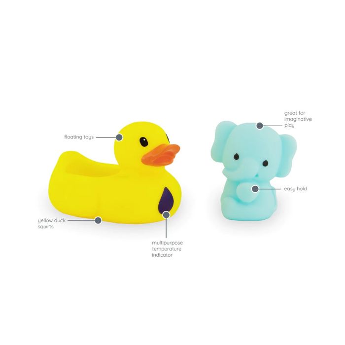 Place this temperature monitoring duck and elephant pal in baby's bath water as you fill up the tub. The duck's temperature water drop indicator will turn red when the water gets too hot, making it easy to detect excessive heat and adjust the water temperature accordingly. Little ones will love pretend play with their floating yellow duck and removable elephant pal. Simplify bath time with these safe, yet fun pals by Infantino!