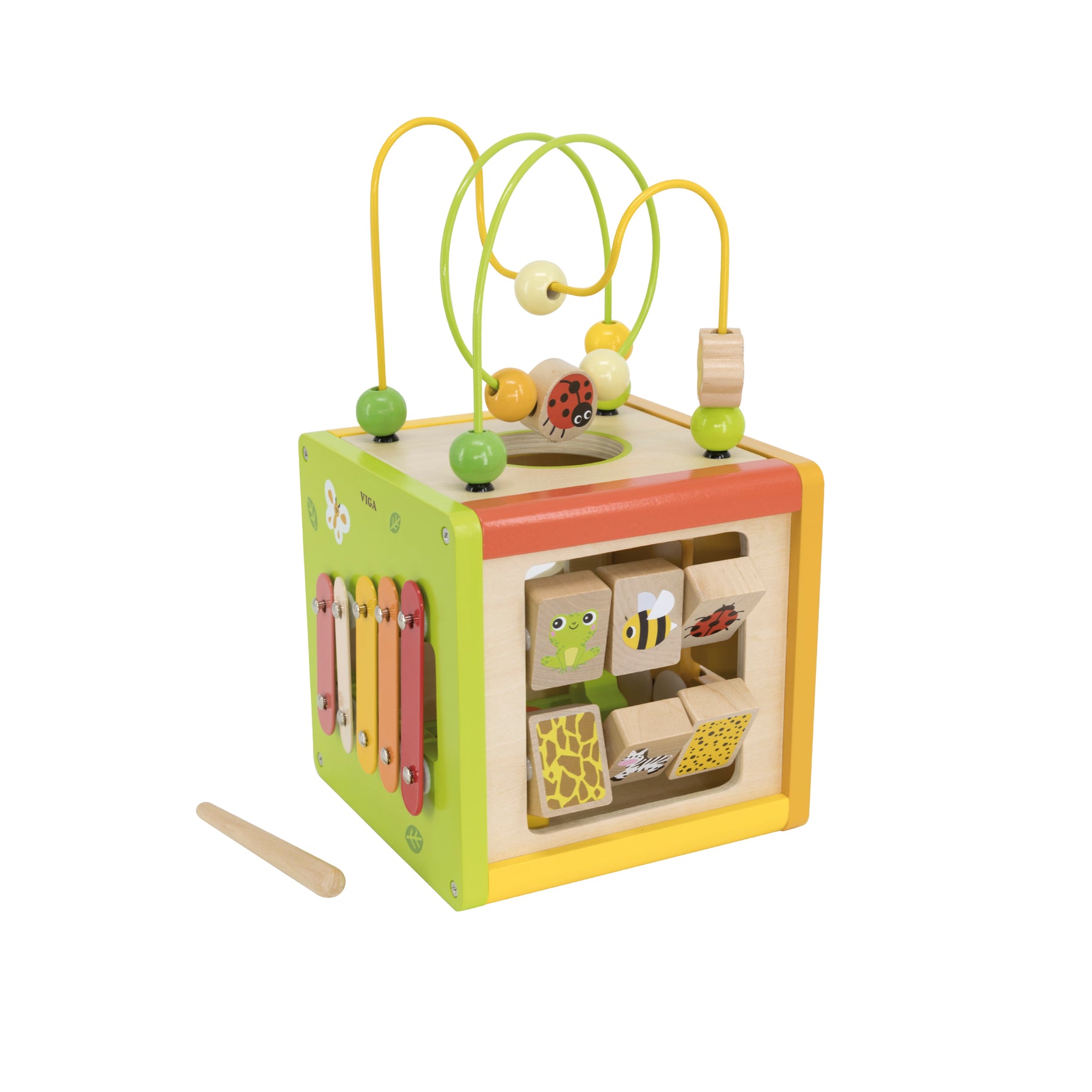 This delicate activity cube features geometric shape sorting, xylophone, track maze, animal flip boards and labyrinth of beads to engage children. The bead maze can be detached to form 2 separate toys. Provides fascinating continuous motion for plenty of dynamic playtime.