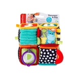 Four soft activity blocks with fun on every side! Baby will love exploring silly sounds, interesting textures, bright colors and cute animal pals. High contrast colors promote visual, sensory discovery. Perfect for stacking, throwing, and learning.