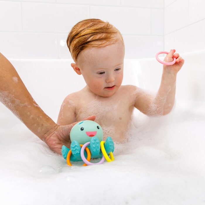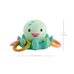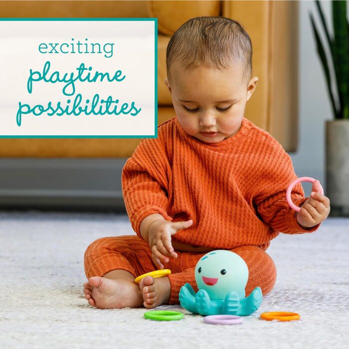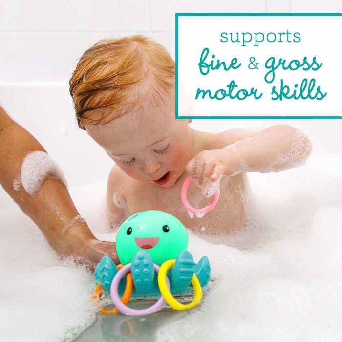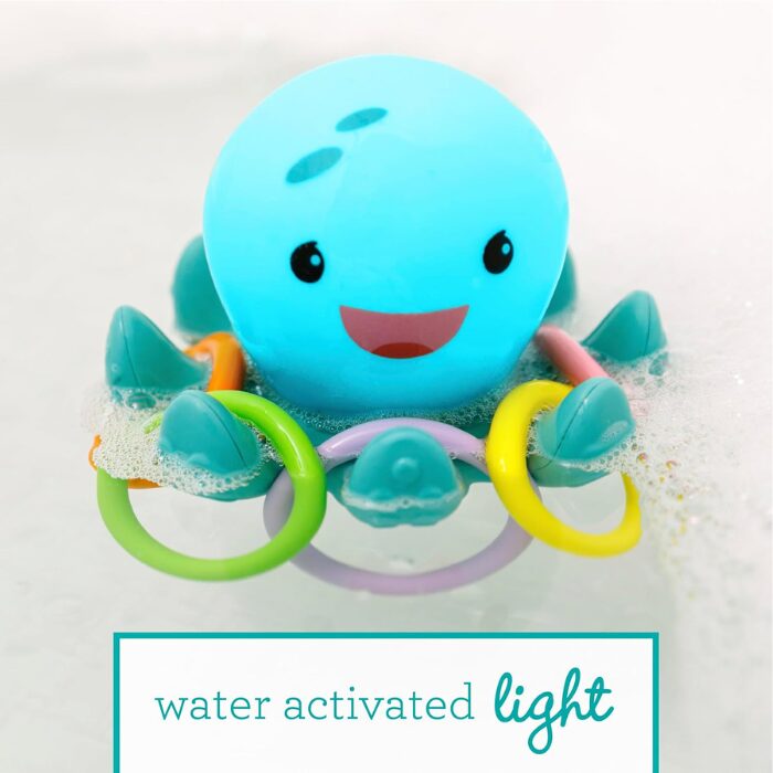 Dive into the deep blue sea of interactive play with the Infantino Light Up Ring Catcher! This fun bath set features one light-up octopus and five colorful tossing rings. Develop fine and gross motor skills when tossing and catching the rings, plus must-touch sensory engaging textures on the tentacles encourage tactile exploration. When placed in water, this bath toy creates a soothing light show for a truly magical experience. This engaging set can be used in and out of the tub for multipurpose play possibilities! This interactive bath set is the perfect addition to bath time. It will help with gross motor and hand-eye coordination skills through an enjoyable playtime experience. Get ready to explore an ocean of adventure with the Infantino Light Up Ring Catcher!