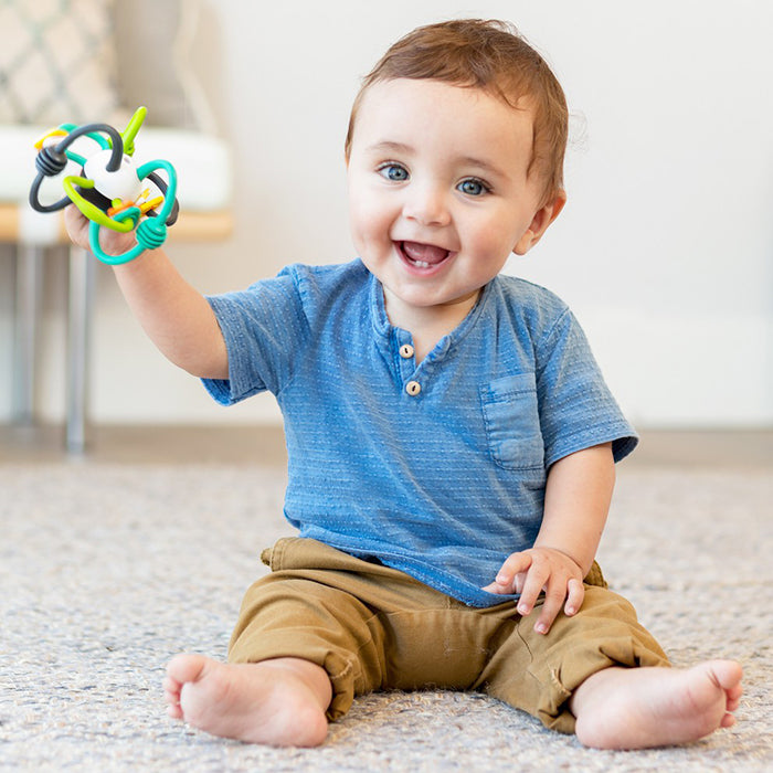 Teether 'n rattle with complex rings to promote fine motor skill development, with movable parts to stimulate spatial exploration. Little ones will love exploring the shapes & textures of this lightweight activity toy! Shake, spin, slide, bend, rattle & teethe for overall sensory stimulation.