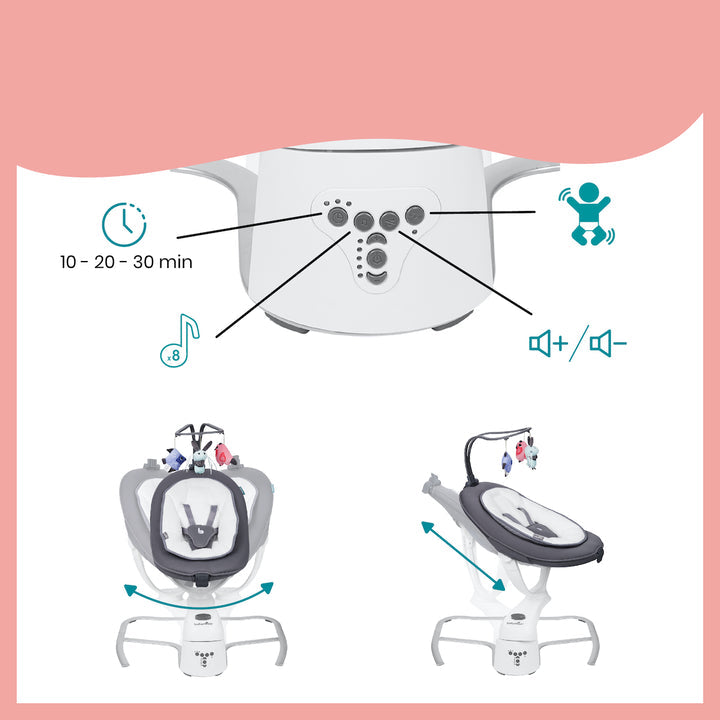 The rocking time can be programmed for 10, 20 or 30 minutes. The motion detector function means that the swing will automatically start once your baby begins to move.