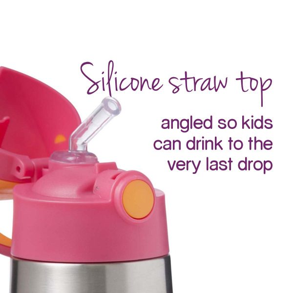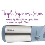 We've redefined cool with our new insulated drink bottle. Our newest drink bottle has insulating super powers! The double walled stainless steel keeps liquids cool for up to 8 hours and warm for up to 6, so now your little one can stay hydrated whatever the weather. Complete with carry handle and push button opening, designed specifically for little hands. Clean modern design and big kid aesthetic. Available in six fab b.box colours. Kids love our easy drinking silicone straw top. Parents love no leaks in the bag (when the lid is closed). Replacement straw packs available, sold separately. When using to keep liquids warm - for best performance fill the stainless steel base with hot water for a few minutes to warm it before pouring water out - and filling with warm liquids.