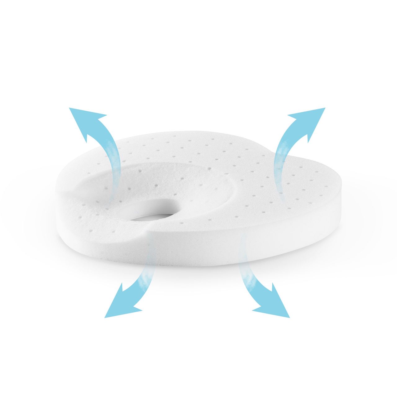 This anatomical head support, which is patented and made in Portugal, is specially angled and shaped to suit the shape of an infant's skull and ensure an even distribution of pressure across the head, whilst allowing total freedom of movement.
