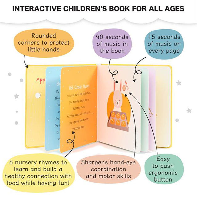 This musical book is all about food and using nursery rhymes to learn and build a healthy connection with food while having fun. Songs included in this book, such as Apples and Bananas, are a great way to learn long vowel sounds. A wonderful book helps your little one connect with food, enhance vocabulary, memorization, and pronunciation.