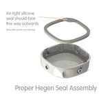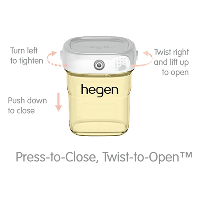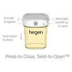 World's first patented no screw thread closure. The Hegen press-to-close, twist-to-open innovation allows the bottle to be pressed on and twisted off conveniently with zero spillage