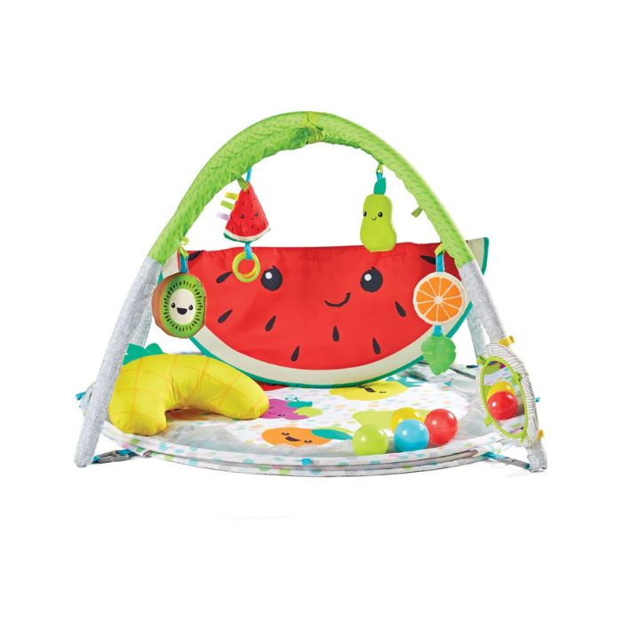 Babies will love this adorable transforming fruit-inspired play gym & ball pit. This 32" oversized play destination is packed with fun. Equipped with 40 easy-to-hold balls, 4 engaging sensory toys, 1 giant selfie mirror, and 1 super cute pineapple tummy-time bolster, the 4-in-1 Jumbo Activity Gym & Ball Pit does not disappoint.
