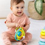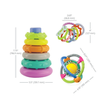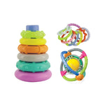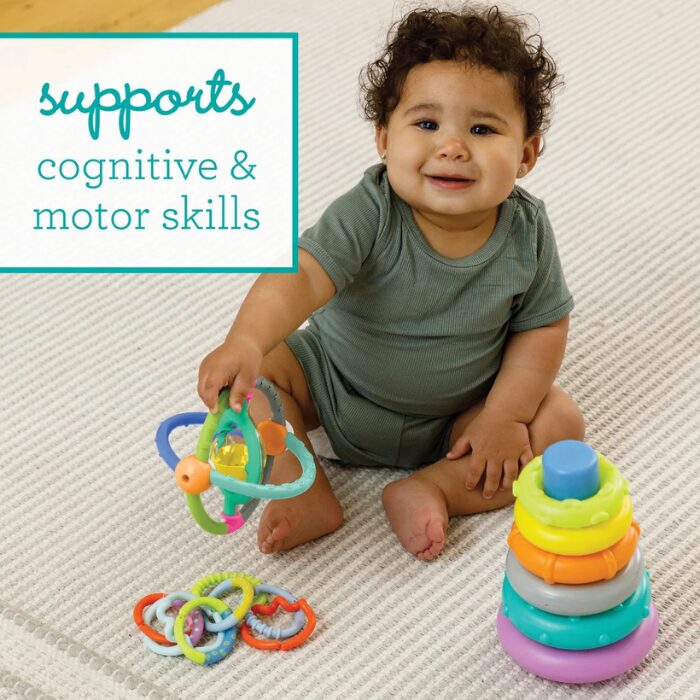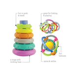 • The Infantino Box of Cheer provides three must-have baby toys, including Rock 'n Rings, Orbit Rattle, and Ring Links.