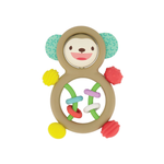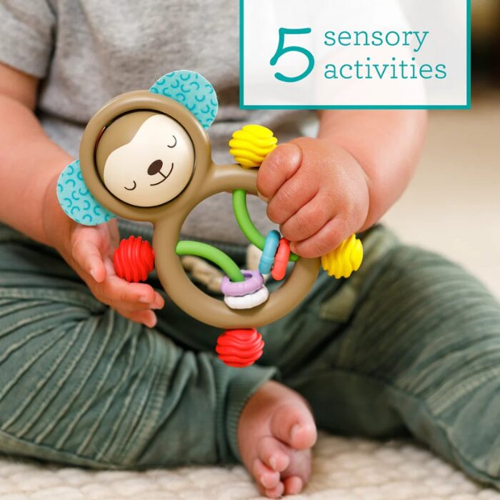 The Infantino Busy Lil' Sensory Rattle engages the senses. This adorable character is packed with 360 degrees of exploration and playtime fun! Your baby can explore mixed materials, from soft fabric ears to durable teethable textures, and spin the monkey's head to see its facial expression change. You'll love hearing your baby shake it for exciting rattle sounds! The two bendy bars with interactive sliding rings help develop fine motor, cause and effect, and sound recognition skills. They'll love that this perfectly sized toy is easy to hold and take on-the-go adventures with them! Give your little one the gift of endless entertainment and sensory exploration with the Infantino Busy Lil' Sensory Rattle today.