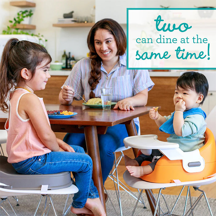 Babies and parents will love this extra-handy converting booster seat. The Grow-With-Me 4-in-1 Two-Can-Dine Feeding Booster Seat converts into an infant and toddler booster seat so two can dine at the same time! This booster seat easily attaches to your dining chair and gives your little one a seat at the dining table. Its grow-with-me functionality can be used with a single child from infant to toddler.