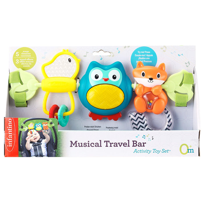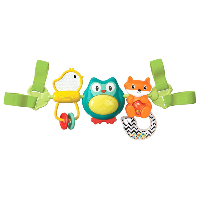 Babies will go gaga for this light-up musical travel bar. Spinning animal pals feature a rattle, interesting fabric textures, rainbow ribbons, and a mirror. Animals spin 360 degrees. Fits across most strollers and car seats. Press the owls brightly patterns stomach to activate lights and music.