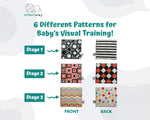 Stage 1 (0-3 months) - Black and white patterns activate the baby's visual nervous system. These patterns stimulate the development of the optic nerves of your newborn baby.
