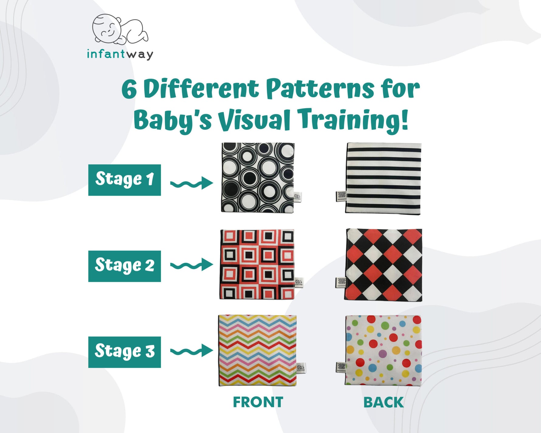 A Visual Training and Sensory Crinkle Toy in one! Infantway Visual Training and Sensory Cloth Toy Set is a simple and affordable toy that will surely be your baby’s instant favorite! Designed in 3 stages and double-sided visual training patterns, this toy will be great for your little one’s vision and brain development! A Cloth toy perfectly sized for tiny hands to grasp, babies will learn and be entertained from the simple sensory stimulation and crinkle sound this amazing toy makes!