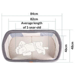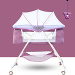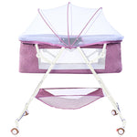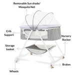 This is a foldable, movable, portable and rocking co-sleeper bedside baby bed. It includes wheels with brakes for easy movement and rocking motion to soothe the baby to sleep. The storage basket adds extra space for easy access of essentials and a mosquito net protects the baby from insects and light falling objects.