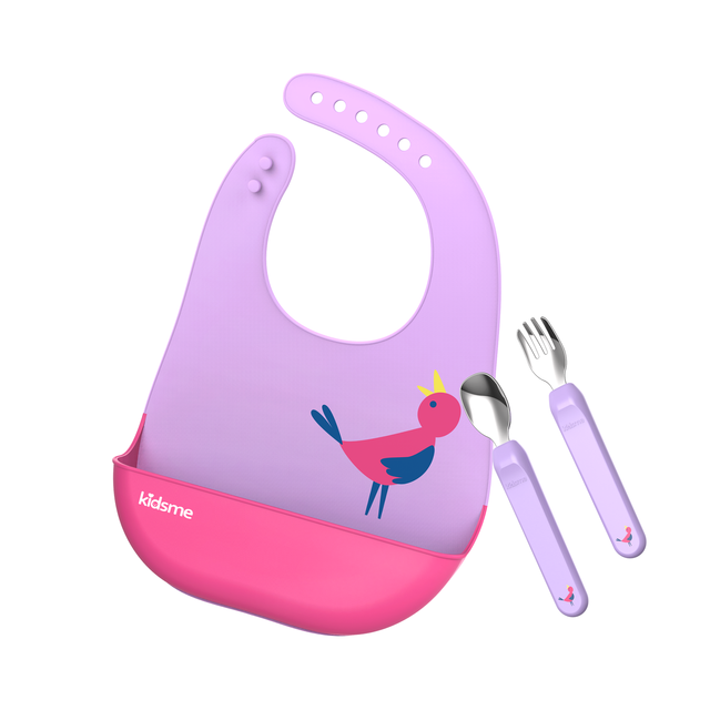- kidsme Deluxe Dining Set includes a bib, stainless spoon, and fork. These can help infants to learn self-dining in a safe and tidy way. Three bib patterns can provide for your own baby or the best baby gifts.