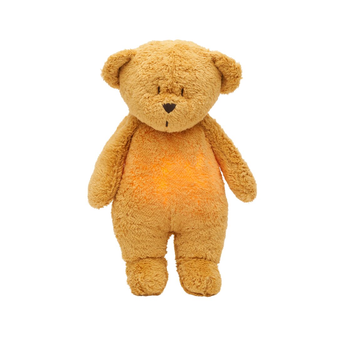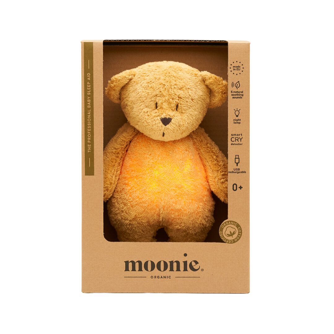 So how can MOONIE is help your little one have a calm sleep and in you in turn take a rest? Moonie plays pink noises and has a soft gentle lamp on its belly. It has a Smart Cry Detector feature that can activate when your baby cries, so it can help soothe your baby back to sleep. As soon as your child starts to stir, the Smart Cry Detector triggers a safe, natural, pink noise soothing your child ensuring they return to a restful sleep. Moonie organic humming bear has a soft lamp on their bellies that shines up to 8 colors—whether steady or pulsating! The sound and light module inside its belly is removable and rechargeable through a hidden zipper under the arm. It also plays soothing pink noises of a mother's womb, forest stream, sea waves, wind, and a lullaby - all of which are recorded in actual or in nature and not computer generated.