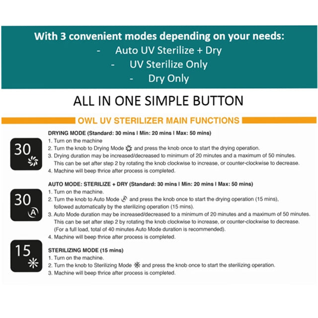 Owl UV Sterilizer & Dryer combines 2 of the best Japanese technologies in one: Waterless sterilization via UV, and 360-degree heat distribution.