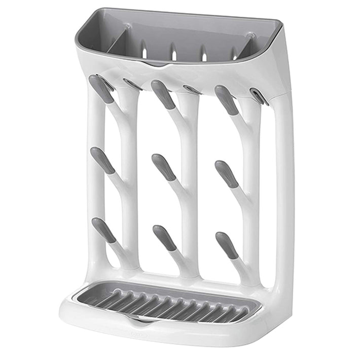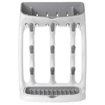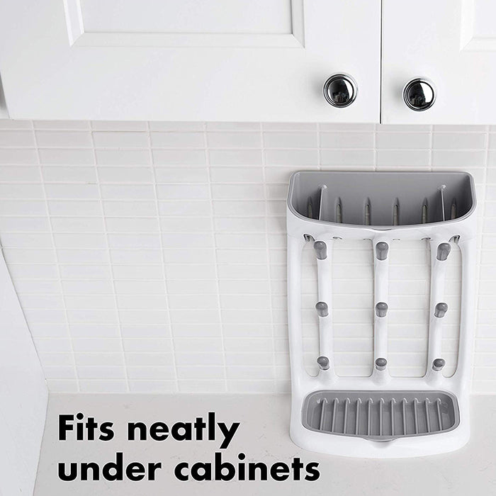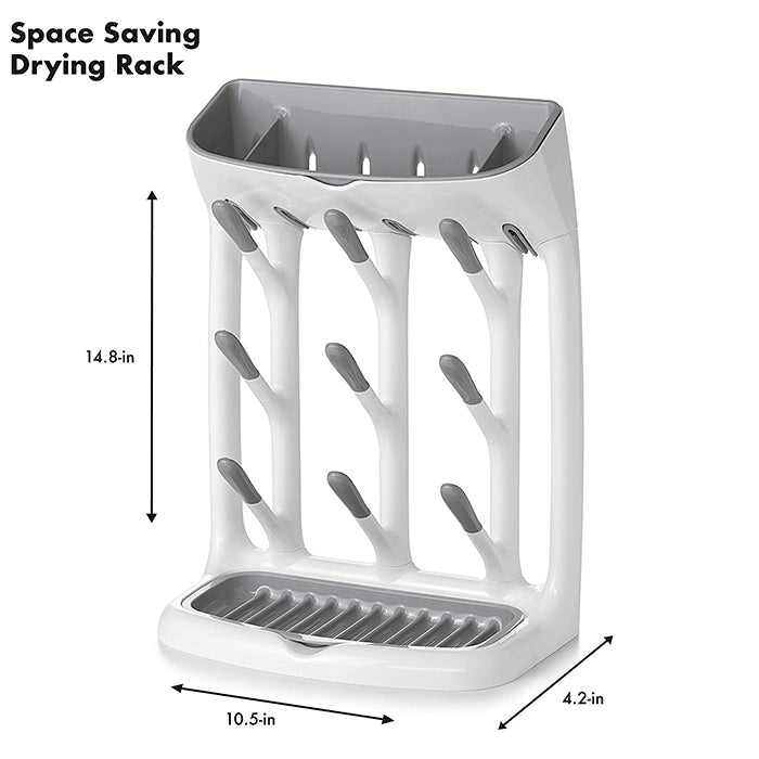 With a compact design that makes a big impact, the Space Saving Drying Rack will hold cups, bottles, and all their parts without cluttering the countertop. The angled pegs hold cups and bottles at just the right angle for thorough drying, while the top and base are perfect for drying small parts like valves, or even pacifiers. The Drying Rack fits neatly under cabinets, so it can be tucked out of the way against the wall. The base tray features ridges to keep lids and more elevated for quick-drying, and both the base and top trays are removable for thorough cleaning.
