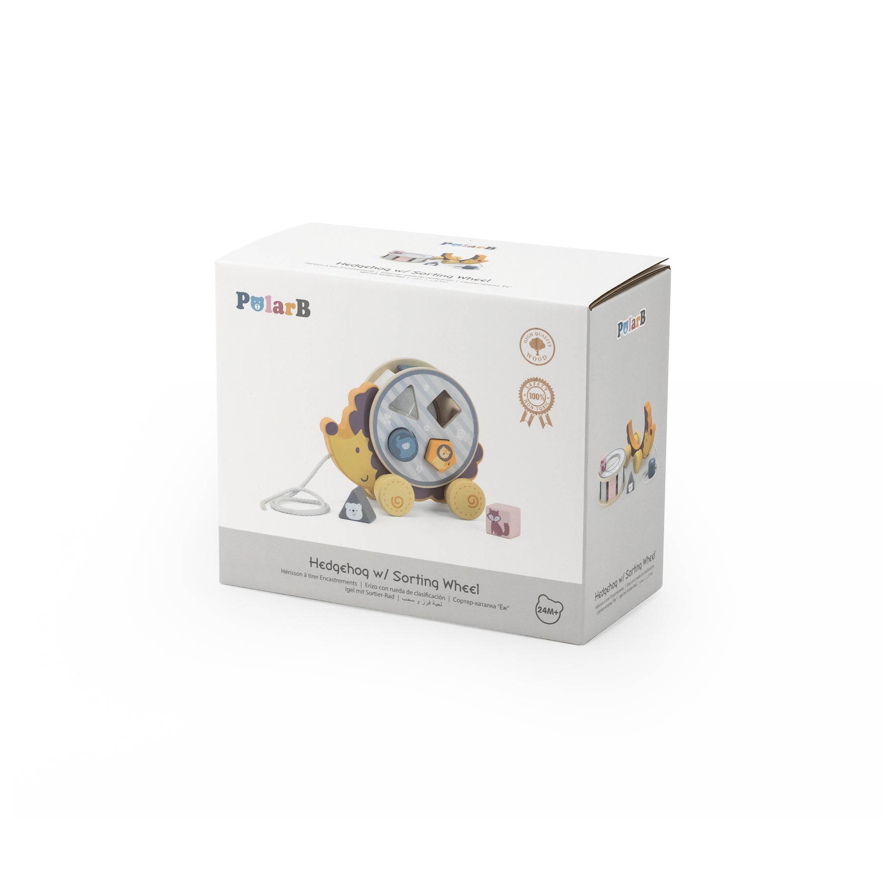 PolarB Pull Along Wooden Hedgehog with Sorting Wheel is fun and educational! Excellent way to encourage babies to start walking - size is approximately 8" x 6.5" x 4" Sorting Wheel turns as the wheels turn and has a soft reach-in feature to make it easy for little hands to retrieve their blocks Enhances motor ability, coordination, and imagination, and the wood animal blocks help teach shape recognition and colors