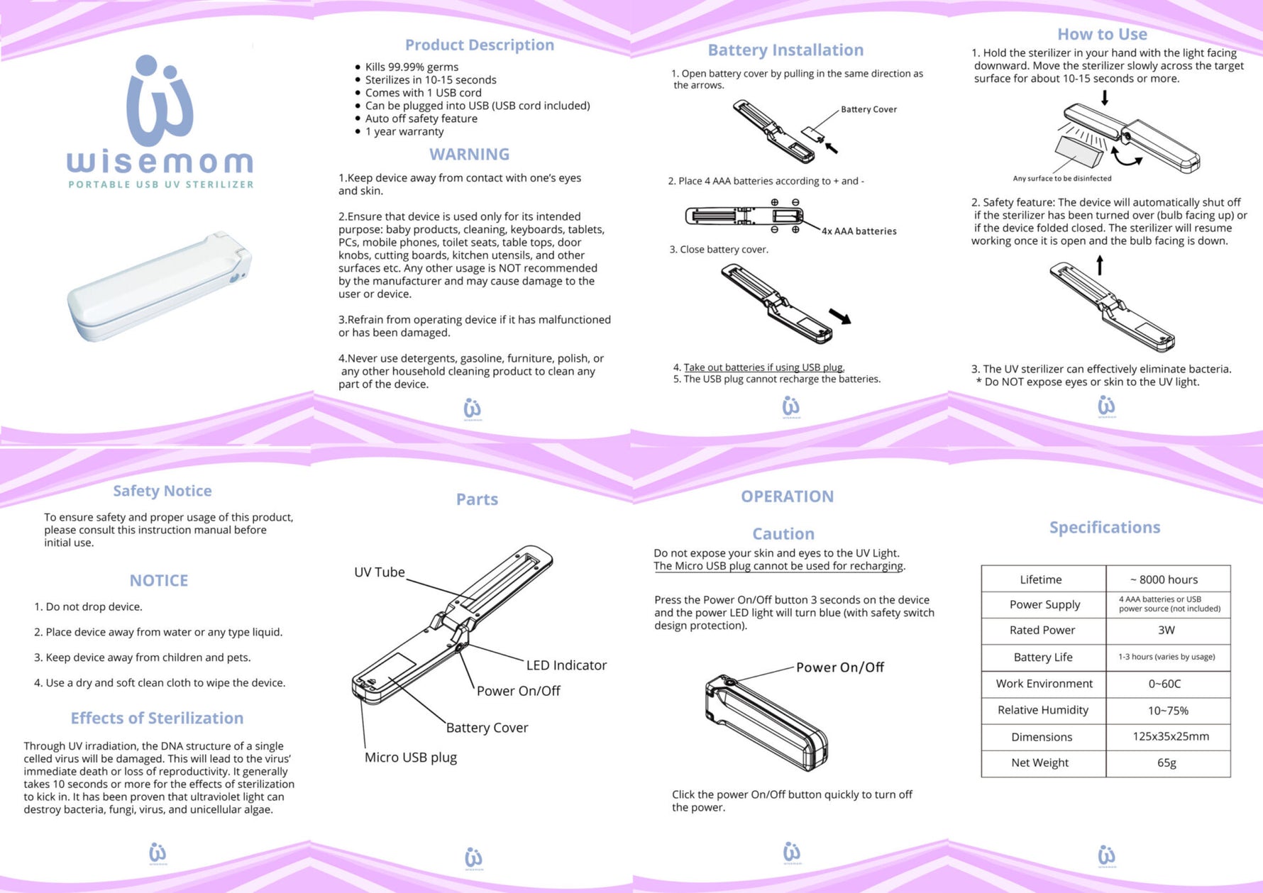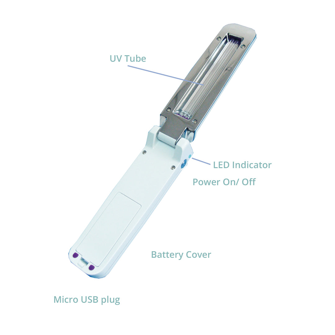 - The device will automatically shut off if the sterilizer has been turned over or if the device is folded closed. It will resume working once it is open and the bulb is facing down.